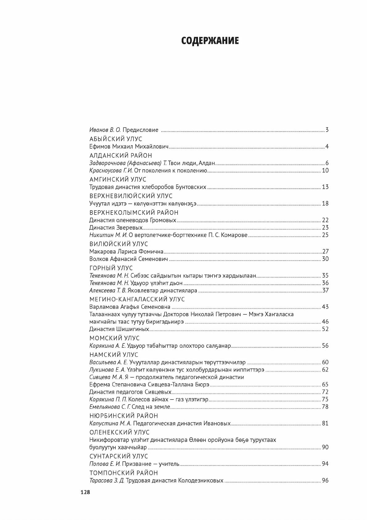 Сборник посвящен талантливым трудолюбивым династиям, внесшим вклад в развитие многих отраслей РС(Я). В семьях, где традиции передаются из поколения в поколение, формируется добросовестное, ответственное отношение к труду, что способствует достижению стратегических целей государства. Эта уникальная книга позволяет увидеть трудовую историю династий глазами людей, для которых работа является не просто способом заработка, а семейным наследием. В чем феномен трудовых династий, как они зарождались, какой вклад внесли в развитие республики — ответы на эти вопросы дают бабушки и дедушки, папы и мамы, их дети, которые пошли по стопам родителей. Издание адресовано широкому кругу читателей, интересующихся трудовой историей РС(Я)