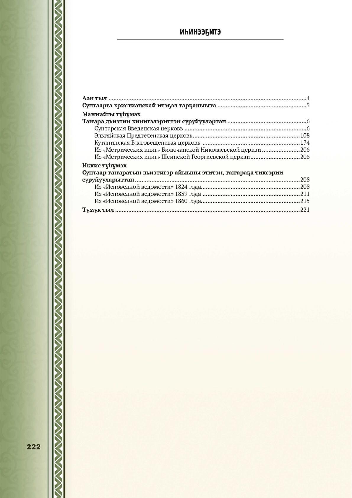 Сунтаар Хорото. Төрүттэрбит ааттара / хомуйан оҥордо, редакциялаата Р. И. Николаева ; консультаннар: Л. И. Николаева, Р. И. Николаева. - Дьокуускай : СӨ НБ БК, 2024. В книгу внесены имена хоринцев из "Метрических книг", "Исповедных ведомостей" Сунтарского, Кутанинского, Эльгяйского церквей до 1916 года. Книга предназначена для хоринцев и краеведов Хоро. Ч. 3. - 2024. - 1 файл (224 с. ).