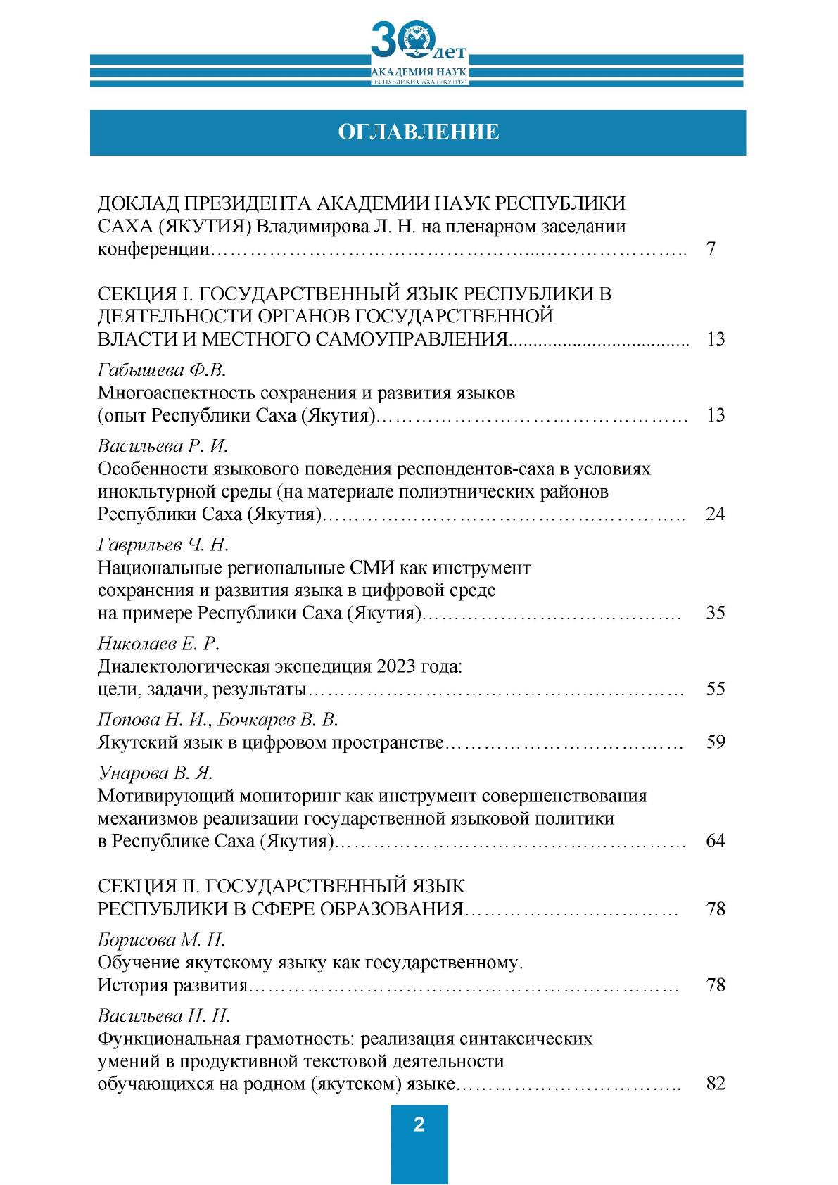 Функционирование государственных языков республик Российской Федерации: состояние и перспективы : сборник трудов Всероссийской научно-практической конференции с международным участием, приуроченной к 30-летию образования Академии наук Республики Саха (Якутия) и открытию Центра изучения, сохранения и развития родных языков (7-8 декабря 2023 г. Якутск, Российская Федерация) ; Академия наук Республики Саха (Якутия), Центр изучения, сохранения и развития родных языков ; под научной редакцией Ф. В. Габышевой. - Якутск : ИЦ НБ РС(Я), 2024.- 1 файл (342 с. ; 21 Мб) : ил.- ISBN 978-5-907700-88-8