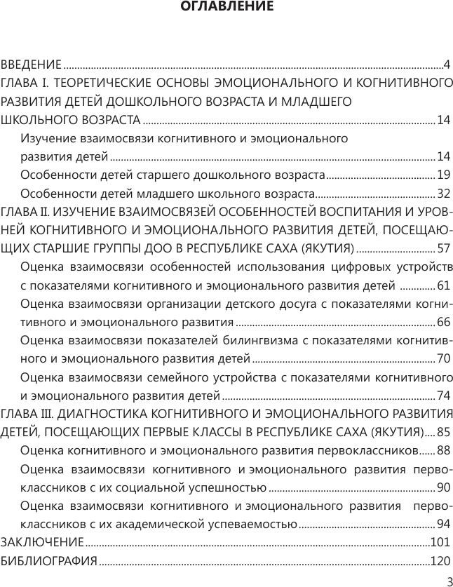 Монография посвящена анализу социально-значимой проблемы возрастной и педагогической психологии — психического развития детей дошкольного и младшего школьного возраста. Представлены результаты диагностики когнитивного и эмоционального развития детей дошкольного возраста в Республике Саха (Якутия) проведенные в рамках проекта "Растем с Якутией" АНО ГРД "Лаборатории детства"; а также взаимосвязь уровней когнитивного и эмоционального развития с адаптацией и социальной успешностью первоклассников. Разработаны нормы развития эмоционального и когнитивного развития детей, адаптированные в Республике Саха (Якутия), что является весьма значимым научным и практическим вкладом. Полученные эмпирические результаты исследования можно в дальнейшем использовать как основы для построения коррекционно-развивающих занятий с детьми дошкольного возраста и младшего школьного возраста. Научное исследование профинансировано в рамках проекта "Лаборатория детства" НО "Целевой фонд будущих поколений Республики Саха (Якутия)" и АК "АЛРОСА" (ПАО)
