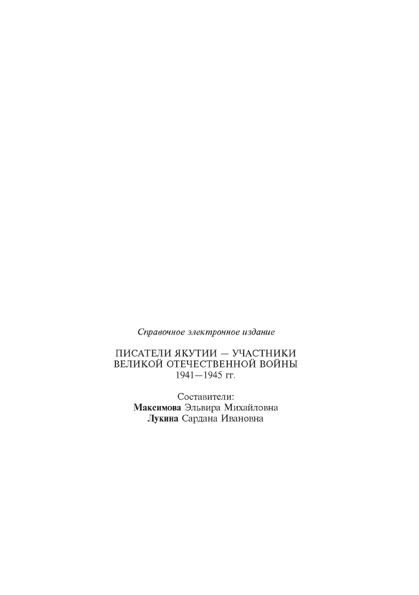 Писатели Якутии - участники Великой Отечественной войны 1941-1945 гг. : биобиблиографические материалы / Национальная библиотека Республики Саха (Якутия), Отдел региональной библиографии, Отдел национальных и краеведческих фондов ; составители: Э. М. Максимова, С. И. Лукина ; редактор В. Н. Павлова ; ответственный за выпуск С. В. Максимова. - Электрон. дан. - Якутск : Электронное издательство НБ РС(Я), 2020. - 1 файл (60, [2] с. ; 3,28 Мб) : портр.