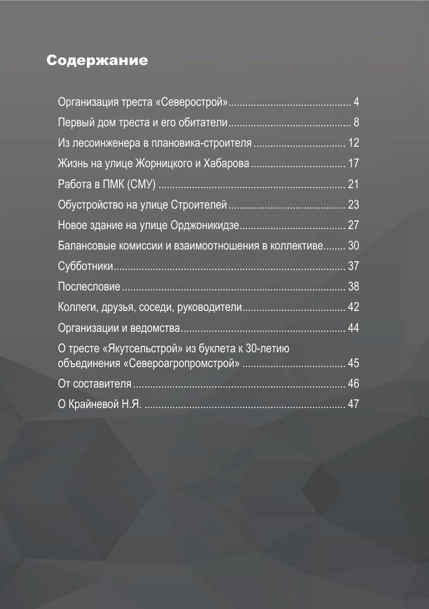 Воспоминания почетного строителя Республики Саха (Якутия) Крайневой Н. Я., начальника планового отдела в ведущей организации сельского строительства Якутии в 60—90-е годы XX века — тресте "Северострой", далее "Якутсельстрой" и "Североагропромстрой", где в годы расцвета работали до 5000 сотрудников. Организация строила одновременно до 400 объектов по всей республике. В книге Надежда Яковлевна рассказывает о становлении и развитии предприятия, о трудовых буднях и праздниках, коллегах и руководителях, упоминается более ста имен. Воспоминания будут интересны тем, кто жил и работал в сельском строительстве Якутии в 60-90-е годы XX века, потомкам строителей тех лет, широкому кругу интересующихся — историей Якутии XX века, плановой экономикой СССР