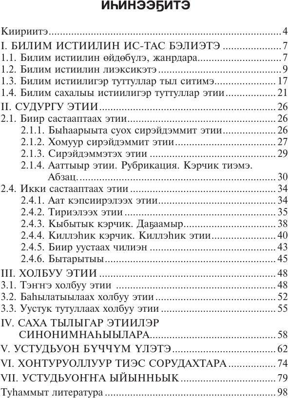 В учебном пособии даются краткие теоретические сведения, упражнения и образцы выполнения заданий. В книге рассматриваются вопросы, касающиеся научного стиля речи якутского языка