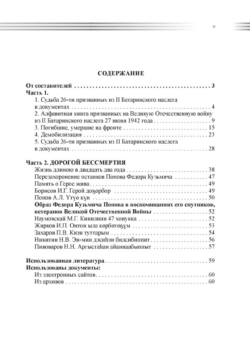 Дорогой бессмертия : судьба 26-ти призванных из II Батаринского наслега в документах : [воспоминания] / составители: О. Е. Дмитриева, А. Дмитриева, А. Николаева, А. Николаев. - Якутск : ИЦ НБ РС(Я), 2021. - 1 файл (62, [1] с.