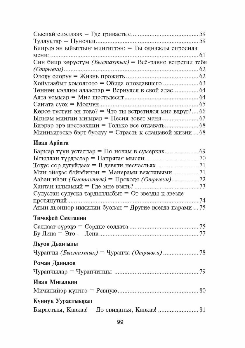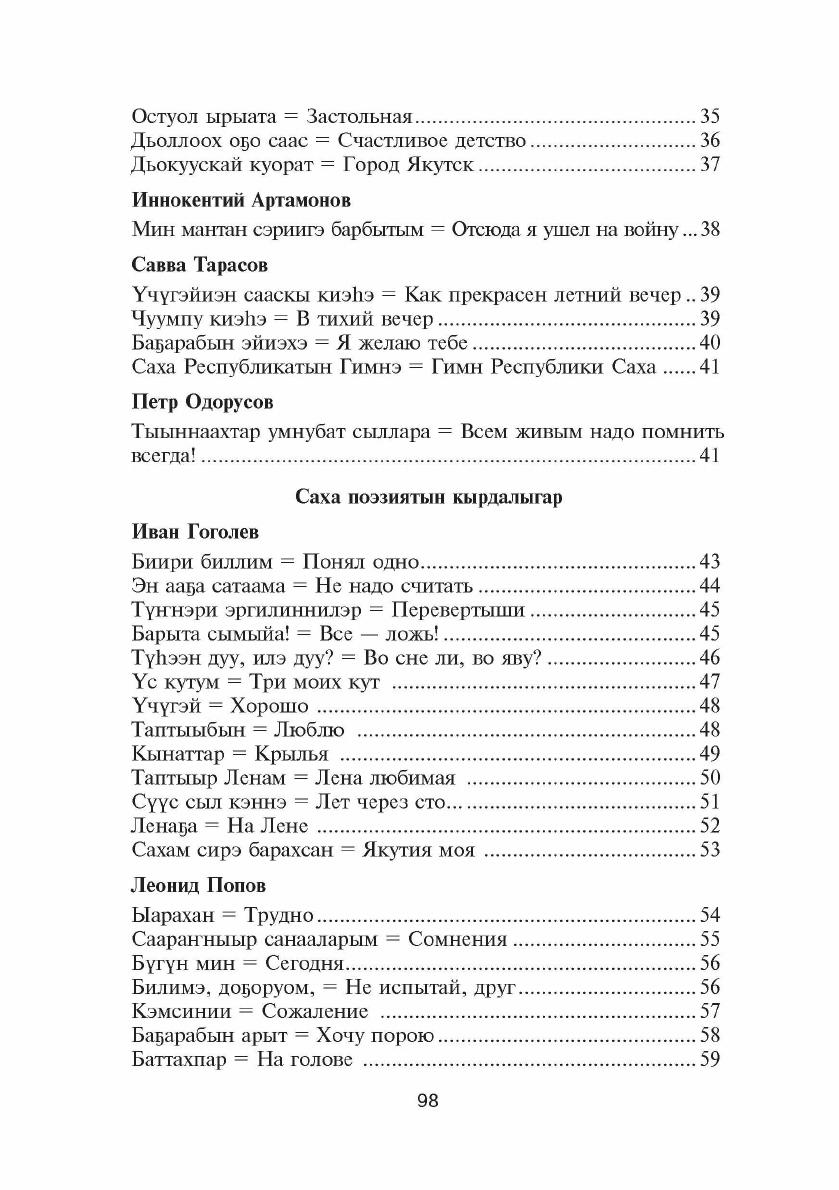 Бу кинигэҕэ М. К. Аммосов аатынан ХИФУ профессора, педагог Т. И. Петрова 26 ааптар 105 хоһоонун сахалыыттан нууччалыы тылбаастаабыта хомуллан киирдэ. Кинигэ үс салааҕа арахсан оҥоһулунна: 1) ХХ үйэ тапталлаах ырыалара; 2) Саха поэзиятын кырдалыгар; 3) Классиктартан тылбаас. Саха норуота тугу эппитэ-тыыммыта нууччалыы өйдүүр дьоҥҥо-сэргэҕэ киэнник тэнийдин-тарданнын диэн сыаллаах хомулунна.