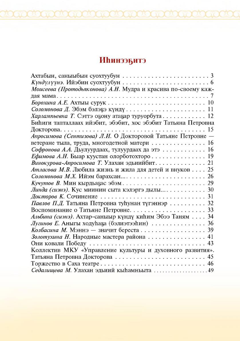 Ийэ истиҥ мичээрэ : [Уус Маайа улууһун Күп нэһилиэгин олохтооҕо, үлэ тыыл бэтэрээнэ, норуот маастара Татьяна Петровна Докторова туһунан ахтыылар] / хомуйан оҥордо, бэчээккэ бэлэмнээтэ Д. И. Чиркоева. - Дьокуускай : СӨ НБ ЭИ, 2022. - 1 файл (73 с. ; 5 Мб) : цв. ил., портр. - ("Саха Өрөспүүбүлүкэтин Национальнай библиотекатын электроннай таһаарылара" серия).