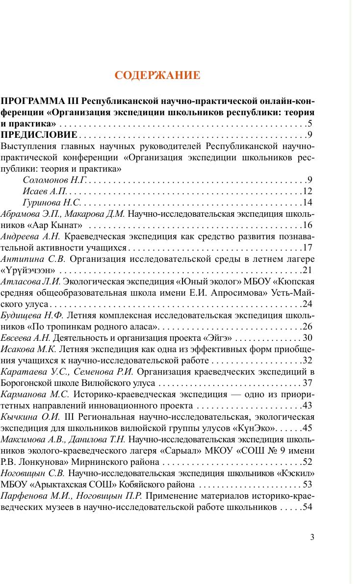 Сборник статей участников III Республиканской научно-практической конференции "Организация экспедиции школьников: теория и практика", 09—10 ноября 2021 года / составитель С. Н. Седалищева ; под редакцией Ю. И. Семенова ; рецензенты : А. П. Исаев, А. В. Пермякова. - Якутск : НБ РС (Я), 2022. - 1 файл (93 с. ; 3 Мб) : портр. - (Электронные издания Национальной библиотеки Республики Саха (Якутия).