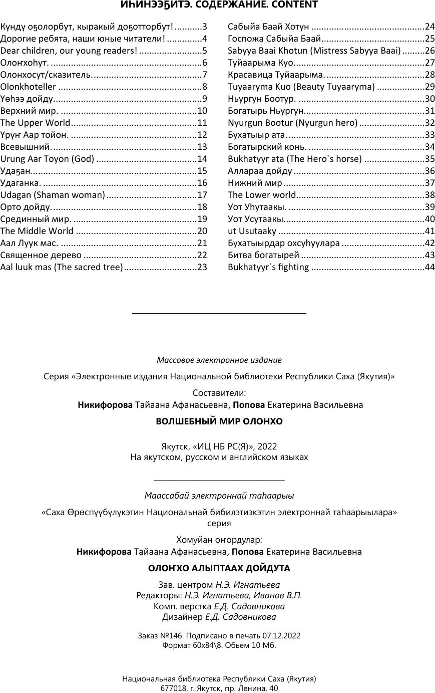Олоҥхо алыптаах дойдута = Волшебный мир Олонхо = Magic world of Olonkho / Национальная библиотека Республики Саха (Якутия), ДТК-Центр детского чтения ; составители: Т. А. Никифорова, Е. В. Попова ; переводчики: с якутского на русский Н. В. Севостьянова, с русского на английский Е. А. Кычкина. - Якутск : НБ РС(Я), 2022. - 1 файл (47, [2] с.