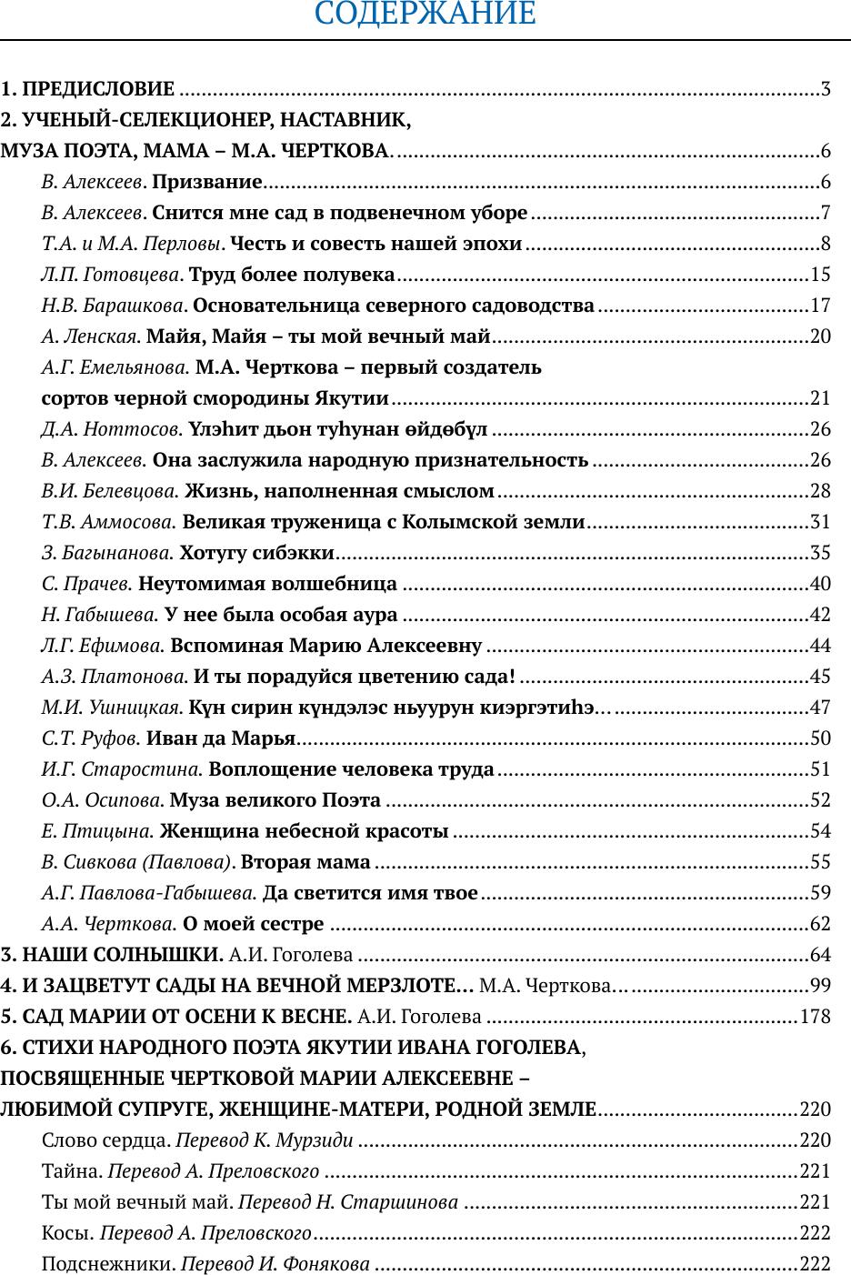 Книга "И зацветут сады на вечной мерзлоте…" посвящена М. А. Чертковой – основоположнице развития северного садоводства. Ее жизнь, как и ее супруга И. М. Гоголева, народного поэта, писателя, драматурга – яркая страница истории Якутии. О ней, ее жизни, пройденной вместе с супругом, рассказывают воспоминания коллег, соратников, близких, друзей, а также она сама. Ей посвящены и рассказы ее дочери, навеянные последними событиями жизни, а также стихи народного поэта Якутии Ивана Гоголева. В труде и жизни Поэта и Сеятеля, посвятивших свою жизнь для блага Якутии, в создании Сада – цветущей земли, в благополучии народа отражена жизнь целого поколения, оставившего нам большое материальное и духовное наследие, составляющее славу и гордость северной земли